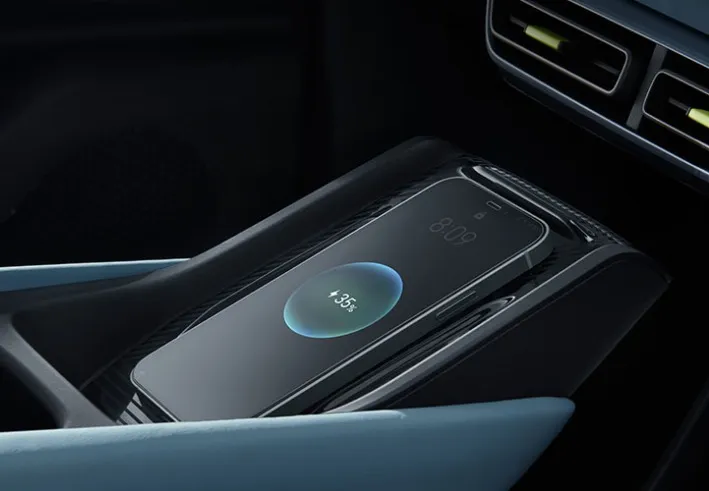 O BYD Dolphin Mini possui um espaço para carregamento sem fio, além de entradas USB tipo A e tipo C. Sem a necessidade de acoplar a chave, oferece máxima praticidade ao usuário.